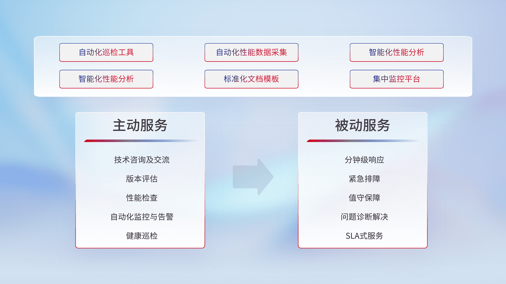 智能化工具和标准化文档,,保障服务质量,,,提供主动服务(包含技术咨询、、、、版本评估、、性能检查、、、自动化监控与告警、、、、健康巡检)和被动服务包含(分钟级响应、、紧急排障、、、值守保障、、、、问题诊断解决、、SLA服务)。。