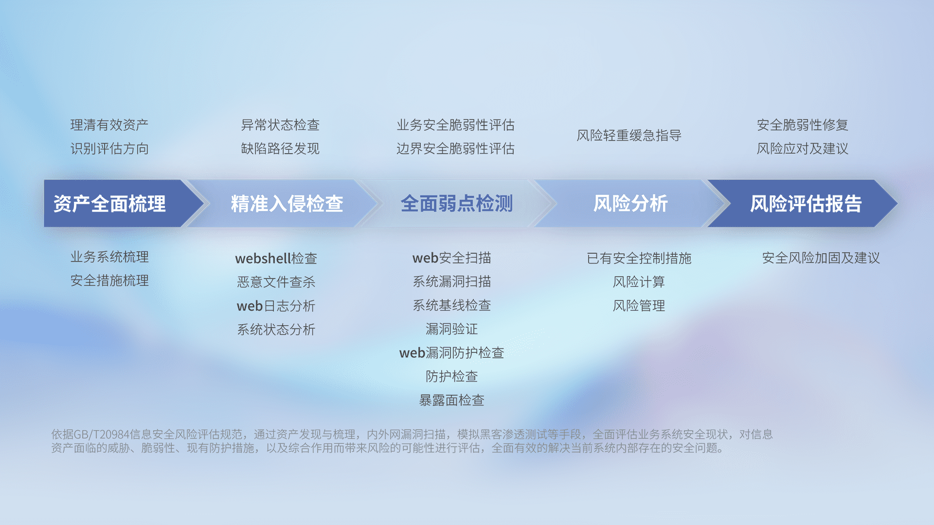 针对客户行业特性,,,以专业的安全服务+多厂商联合解决方案提供专属的一站式安全管理服务,,帮助客户全面感知网络空间威胁,,,,基于识别、、、检测、、、、分析、、、防护、、、、监测、、响应的服务理论模型,,,,从方案咨询、、、集成交付、、评估验证、、、、优化加固、、、运维运营,,,,致力于为客户提供完整的闭环管理式安全服务。。。。以实战经验为客户打造高抵御风险的安全体系,,帮助客户发现威胁、、对抗威胁、、、处置威胁,,,,不断积累安全对抗能力,,,,持续保障数字化安全。。。。